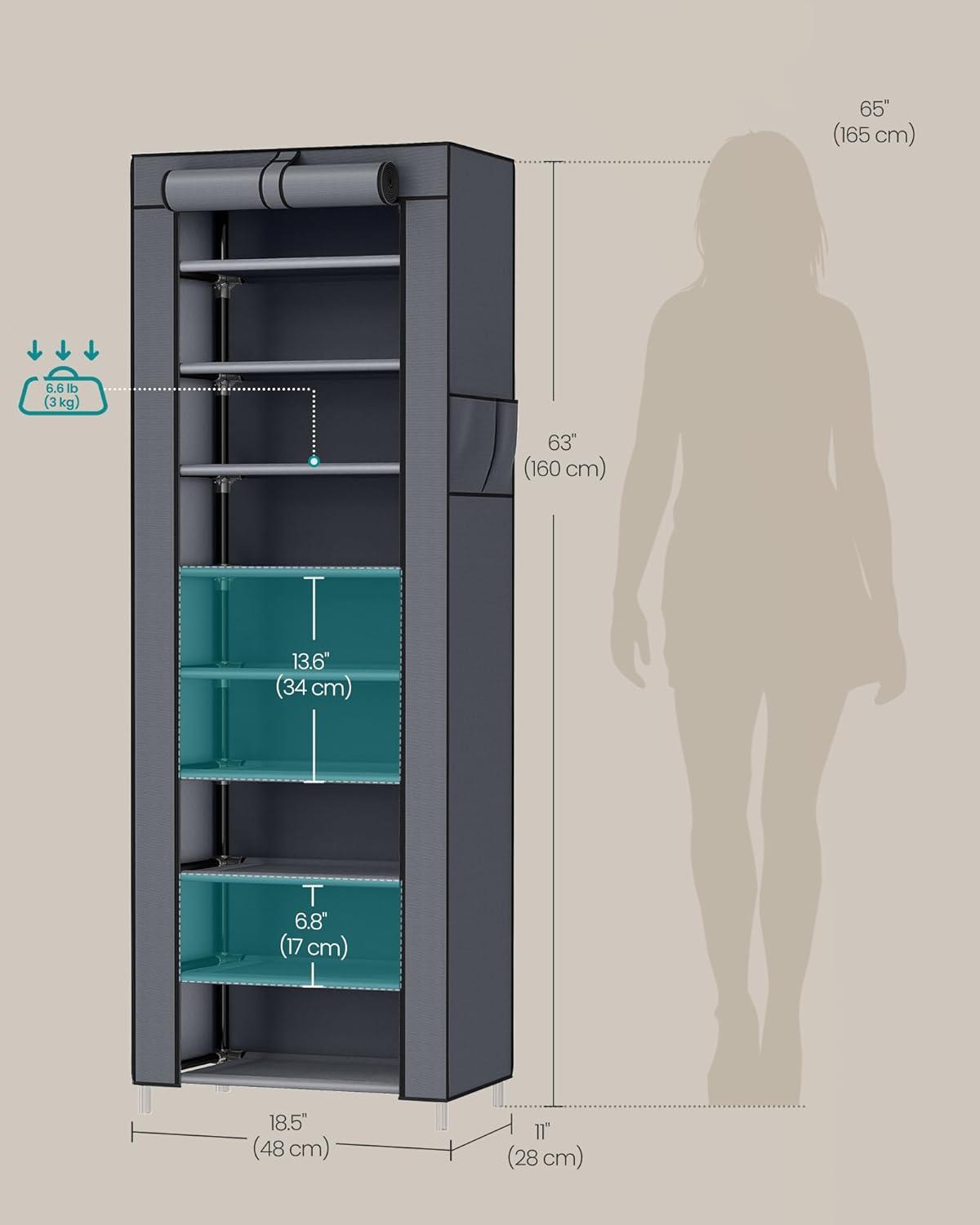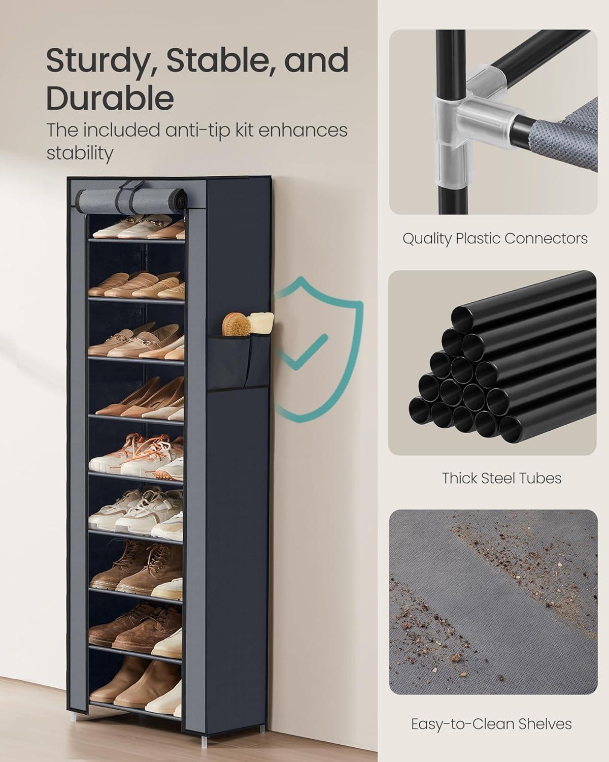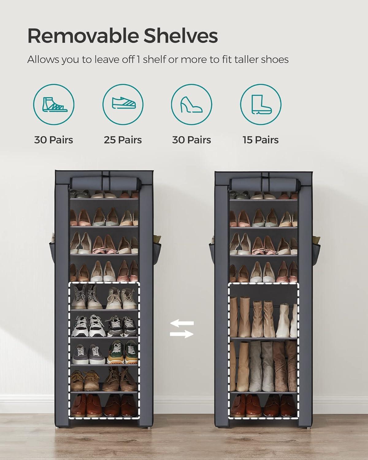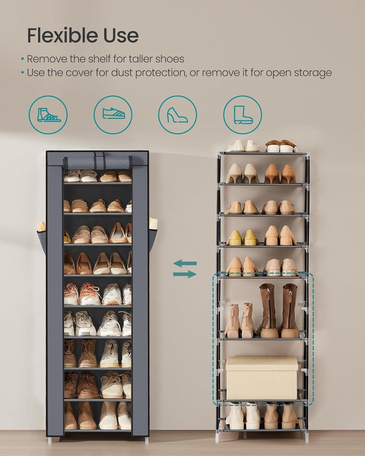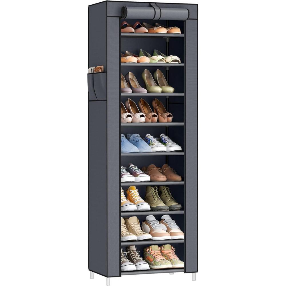 Dustproof Cover and Water-Resistant Shelf: You can zip up the cover of this shoe storage organizer to keep dust off your shoes; the fabric tiers are water-resistant, so just wipe clean with a damp cloth if they get dirty