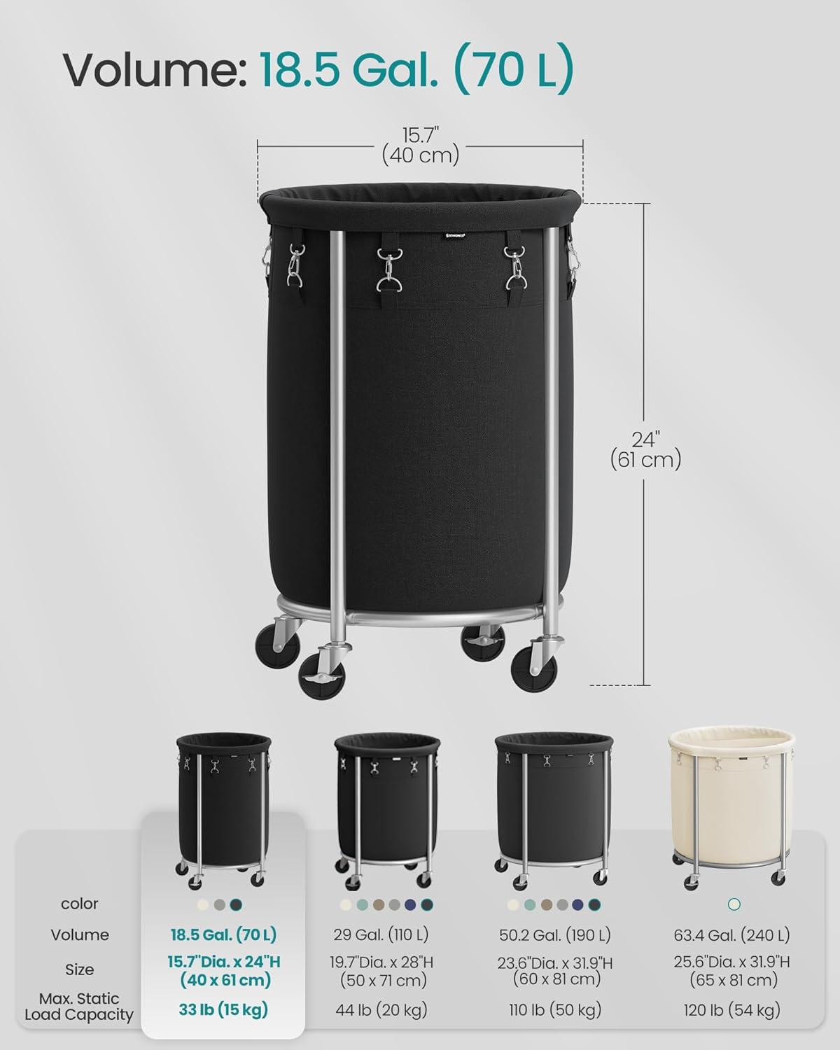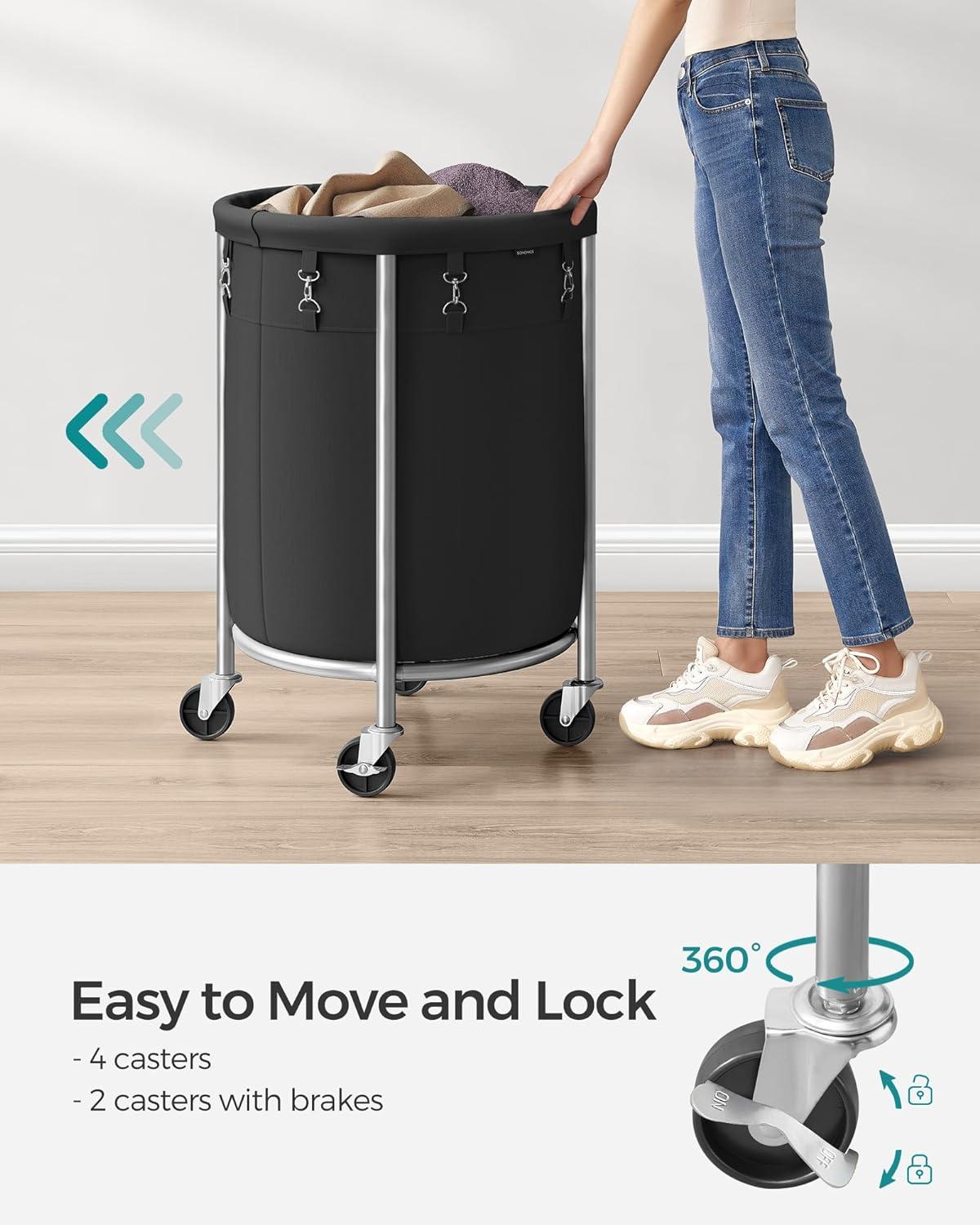 SONGMICS 63.5-Gallon (240 L) Laundry Basket with Wheels, Rolling Round Heavy-Duty Laundry Hamper Cart with Steel Frame and Removable Bag, 2 Locking Wheels, Cream White and Metallic Silver URLS012W01(Ink Black + Metallic Silver)