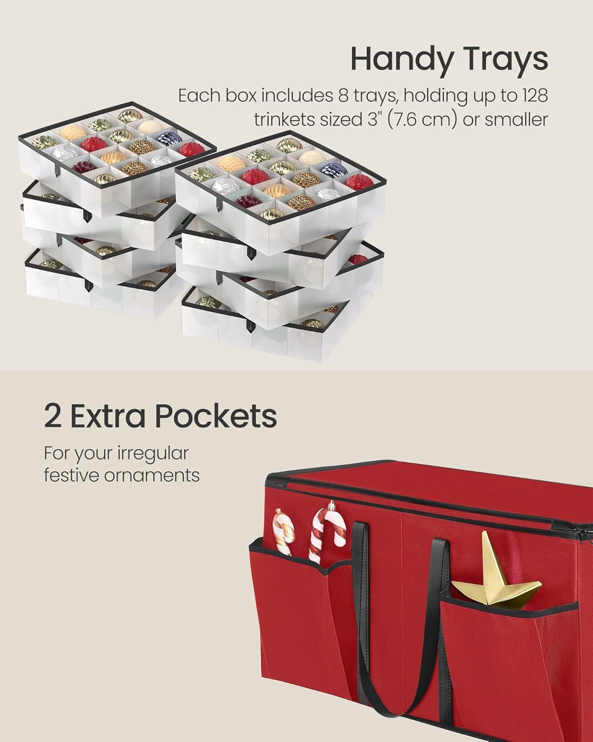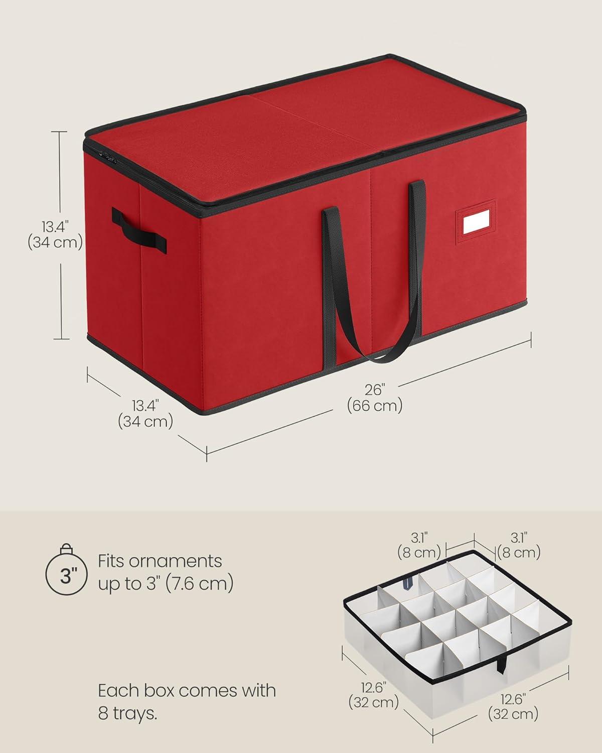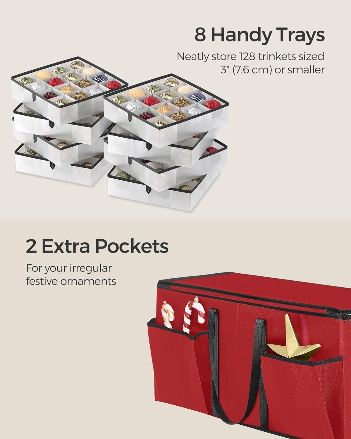 SONGMICS Christmas Ornament Storage Box, Dual Zippers, Stackable Christmas Storage Container with Lid, 8 Trays, 600D Oxford, 3-Inch 128 Slots, Dove Gray URFB035G01(Cherry Red)