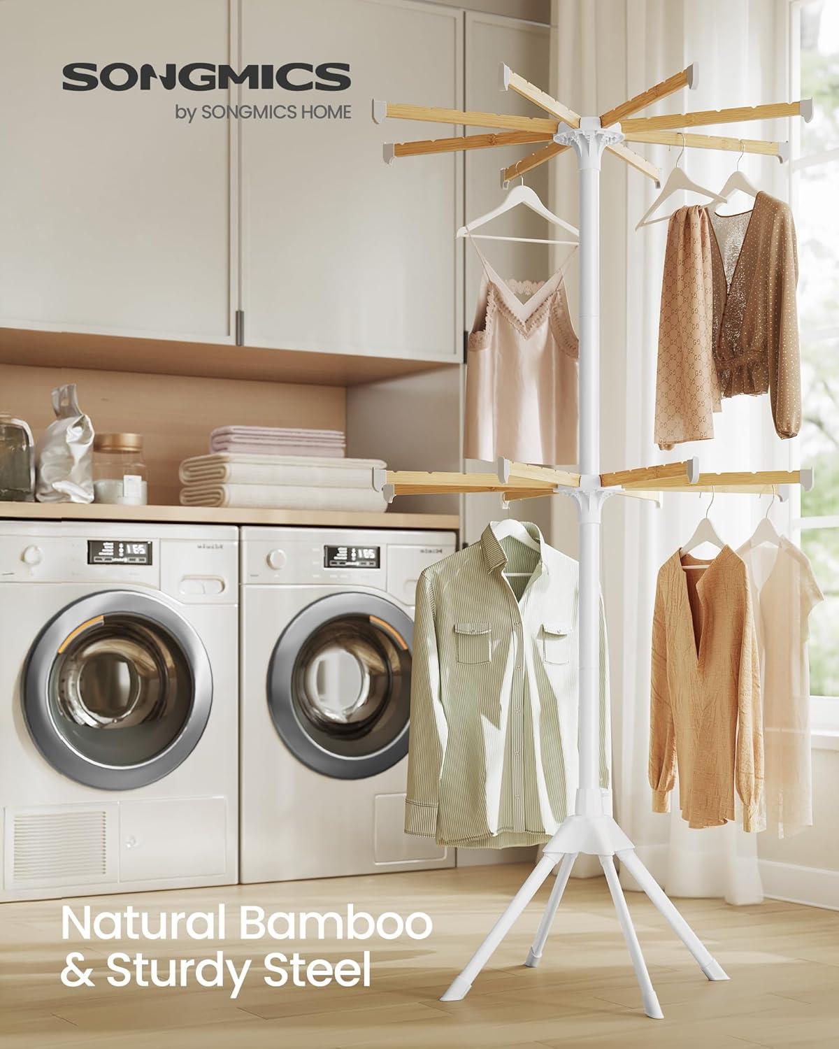 image:imageSONGMICS Clothes Drying Rack with Bamboo Hanging Rods Foldable Metal Laundry Rack SpaceSaving FreeStanding Airer Indoor Use White and Natural ULLR516W012 Tier