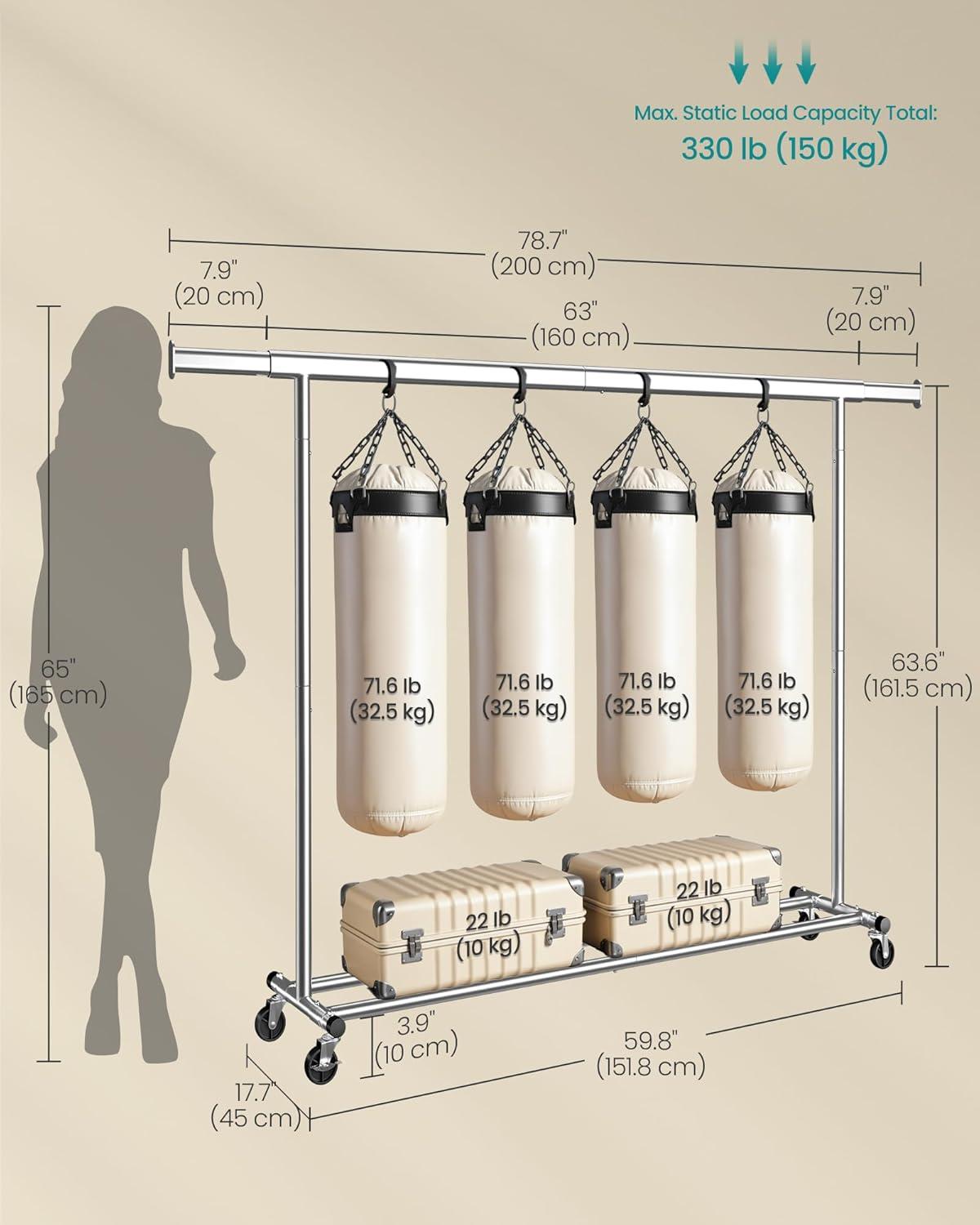 Extendable Hanging Rail: The top rail extends from 63″ to 78.7″ with each end adding 7.9″ of space, giving you room for accessories like handbags, hats, or scarves