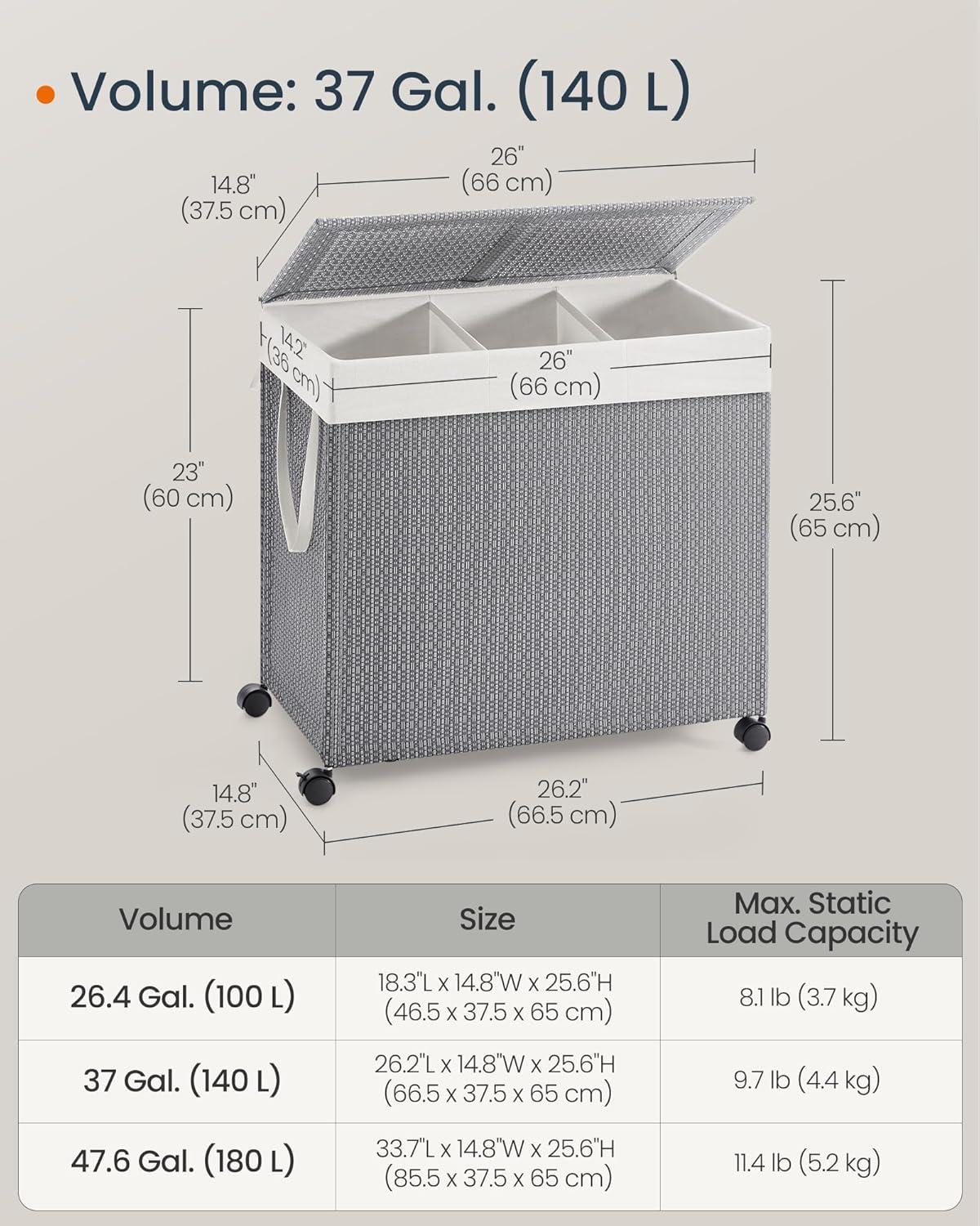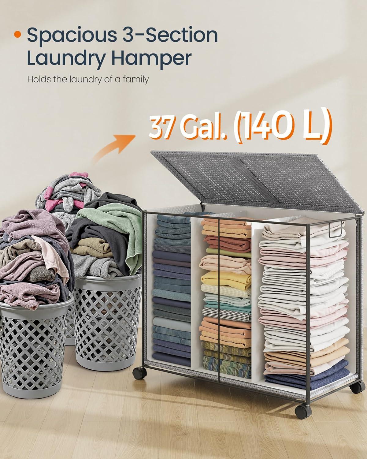 【GENEROUS STORAGE FOR ORGANIZED LAUNDRY】With a 37-gallon capacity, this laundry basket provides ample space for a family's laundry needs. The 3 compartments allow you to efficiently sort laundry by color or type