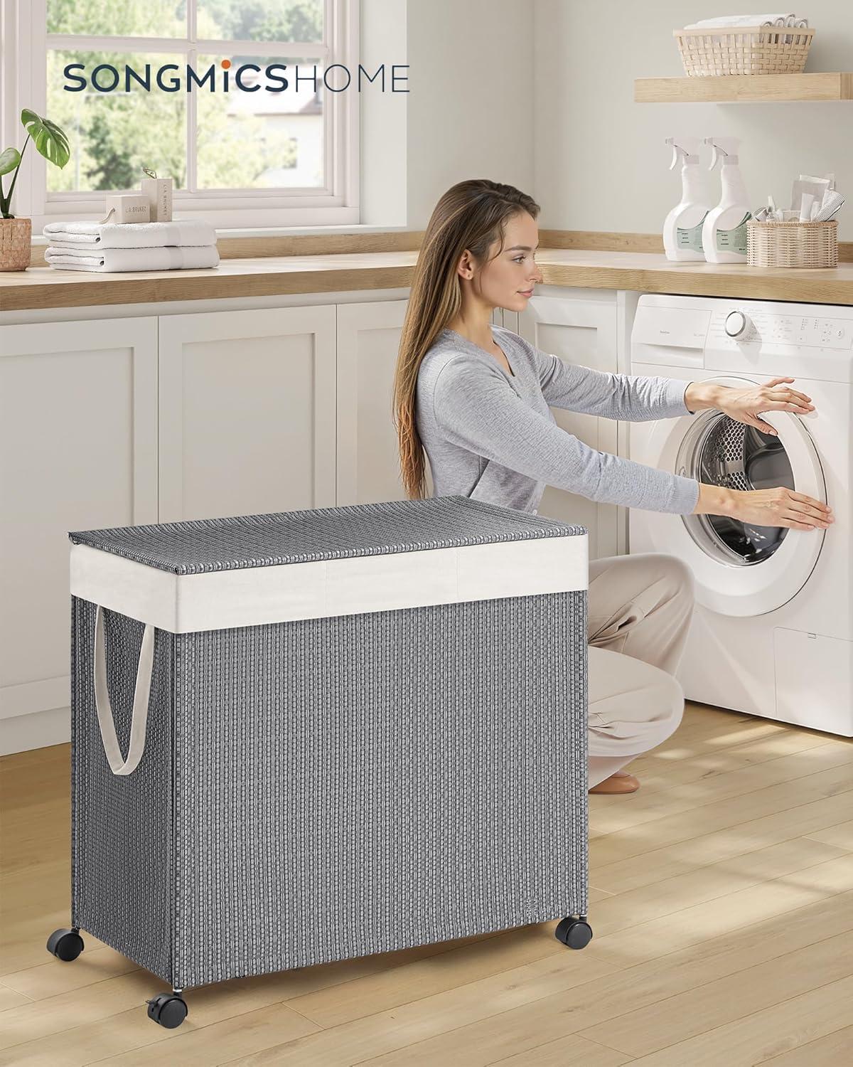 SONGMICS HOME Laundry Hamper with 3 Section, Large 140 L Rolling Laundry Basket with Wheels, Rattan Clothes Basket with Lid, Removable Liner with Handles, Natural Beige and Matte White ULCB602N01(Dove Gray + Matte White)