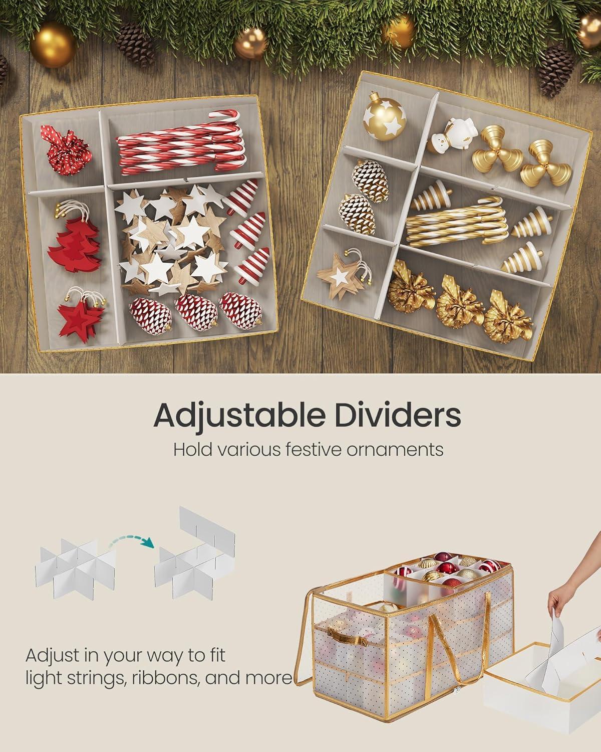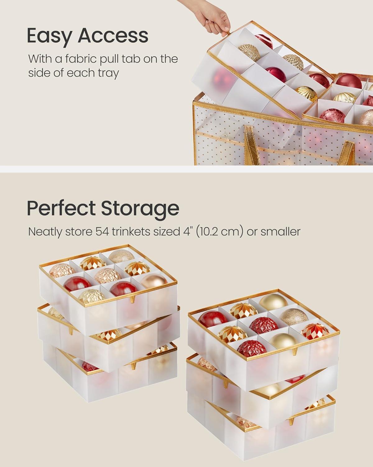 【EASY ACCESS, FLEXIBLE STORAGE】The 6 trays come with fabric pull tabs for effortless access to your treasured ornaments. Need space for bells and light strings? The adjustable dividers are ready to accommodate them! Truly, a Christmas wonder!