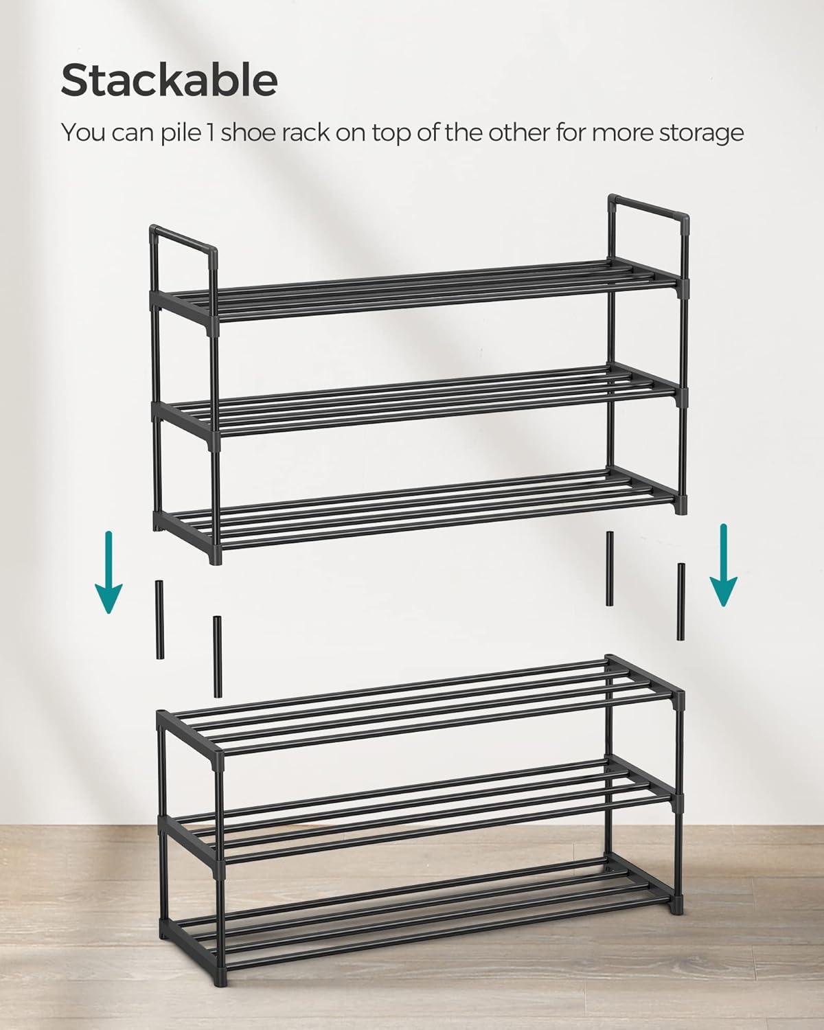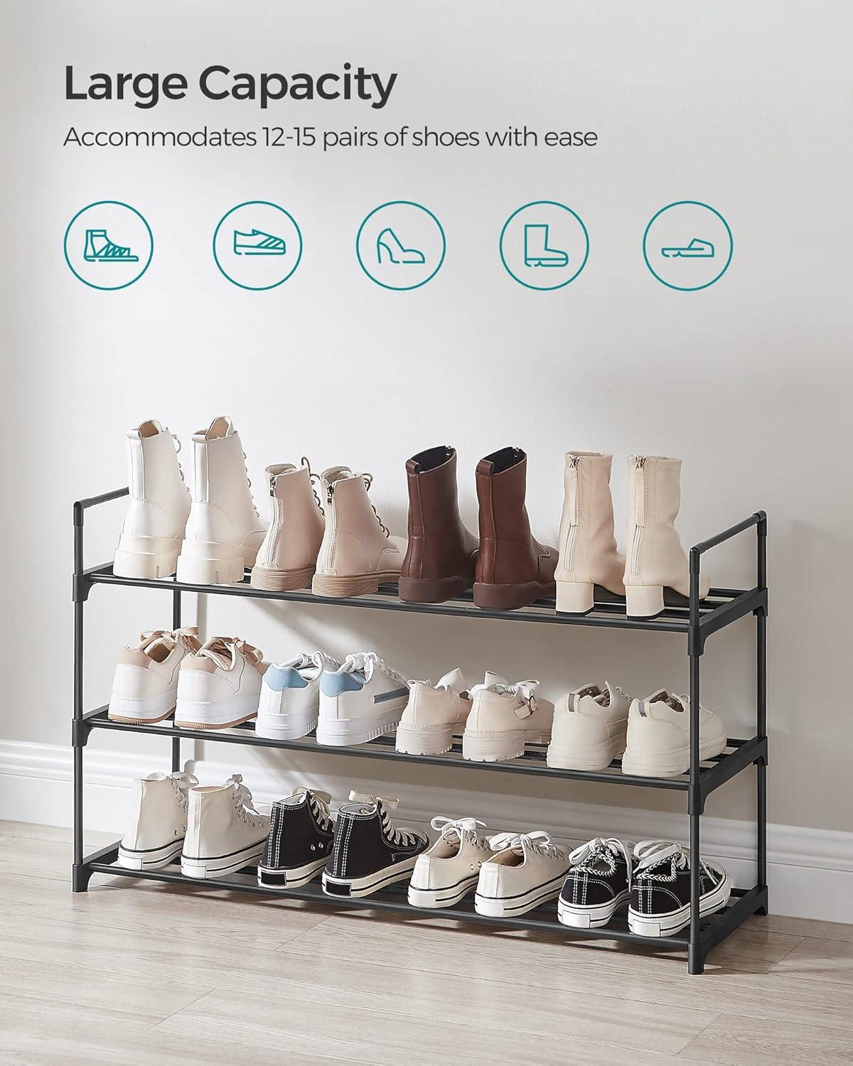 SONGMICS Shoe Rack, 3-Tier Shoe Storage Organizer, Metal Shoe Shelf, 12 to 15 Pairs Shoes, Stackable Shoe Tower for Living Room, Entryway, Hallway, Closet, Black ULSA13BK(Black)