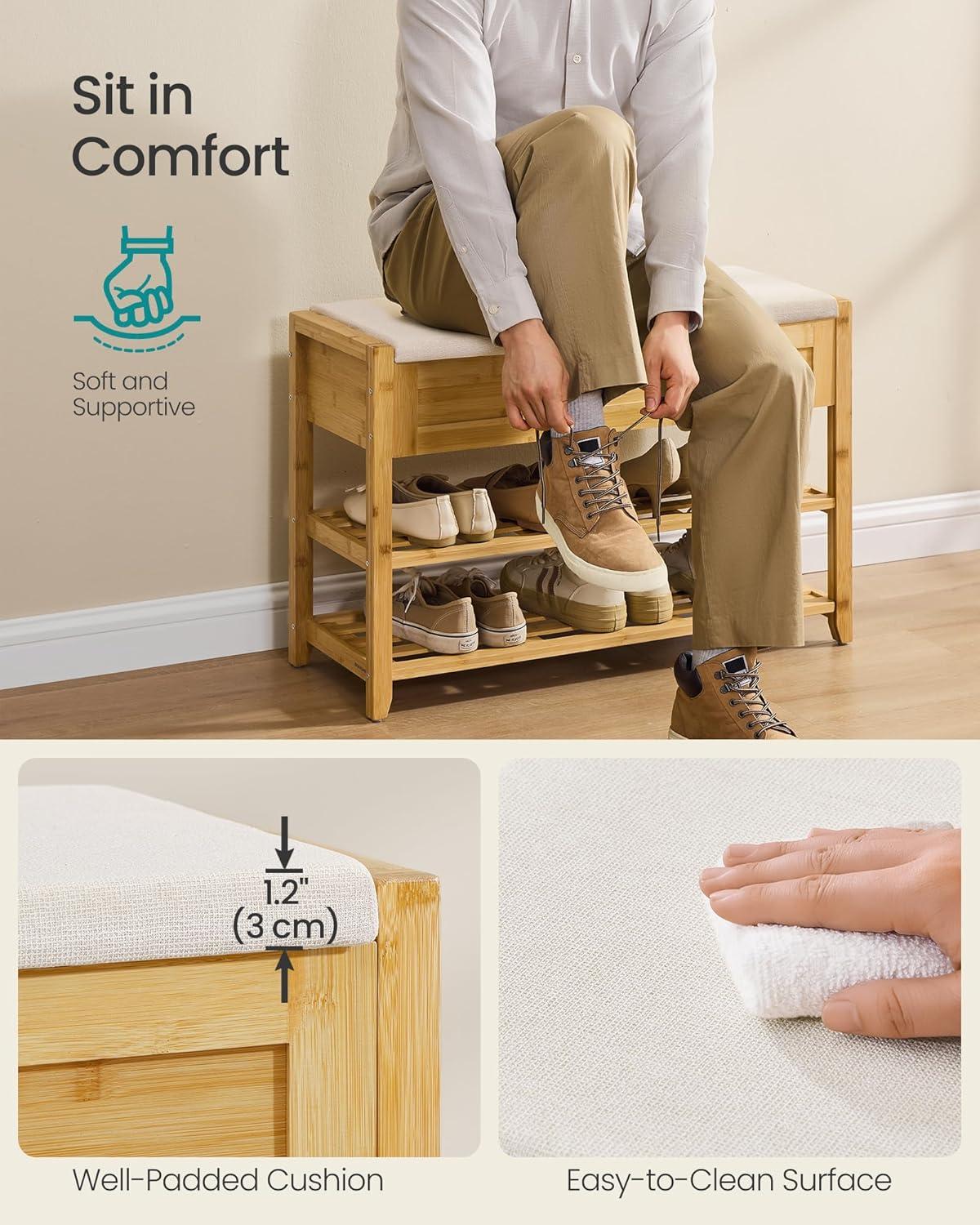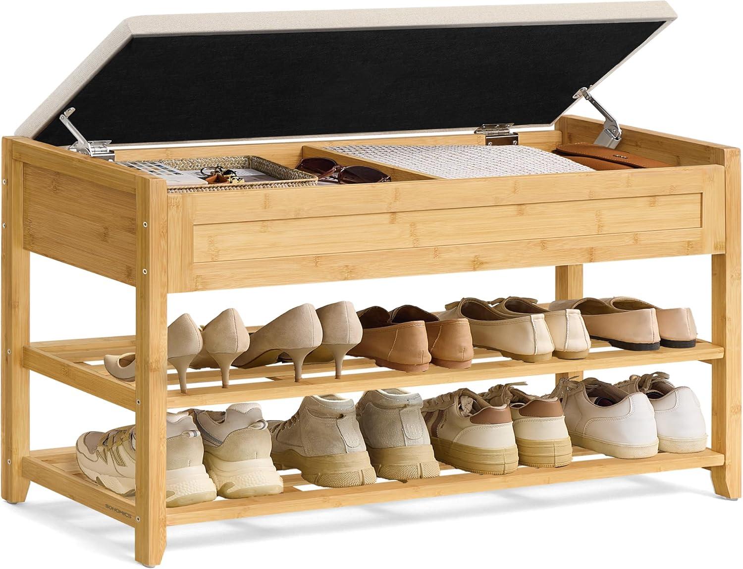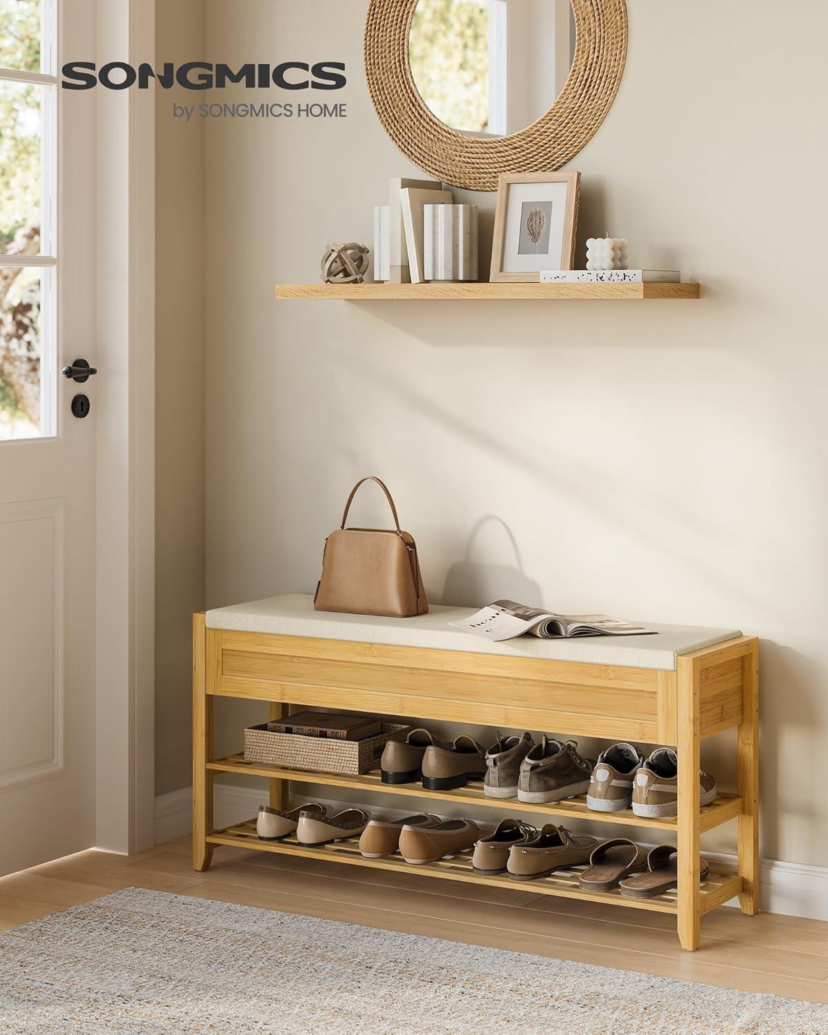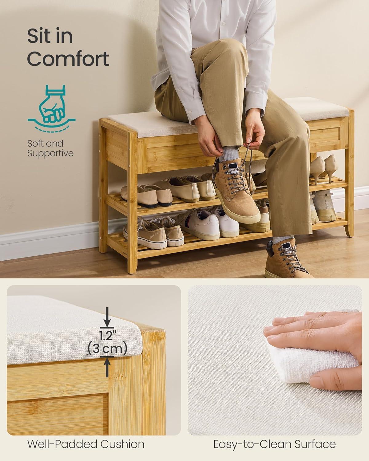 SONGMICS Storage Bench, Bamboo Shoe Rack, Entryway Furniture, 31.5 Inches Wide, Hidden Storage Compartments, 2-Tier Shoe Shelves, for Entryway, Living Room, Bedroom, Dorm, Ink Black ULSB056B01(Natural Beige)