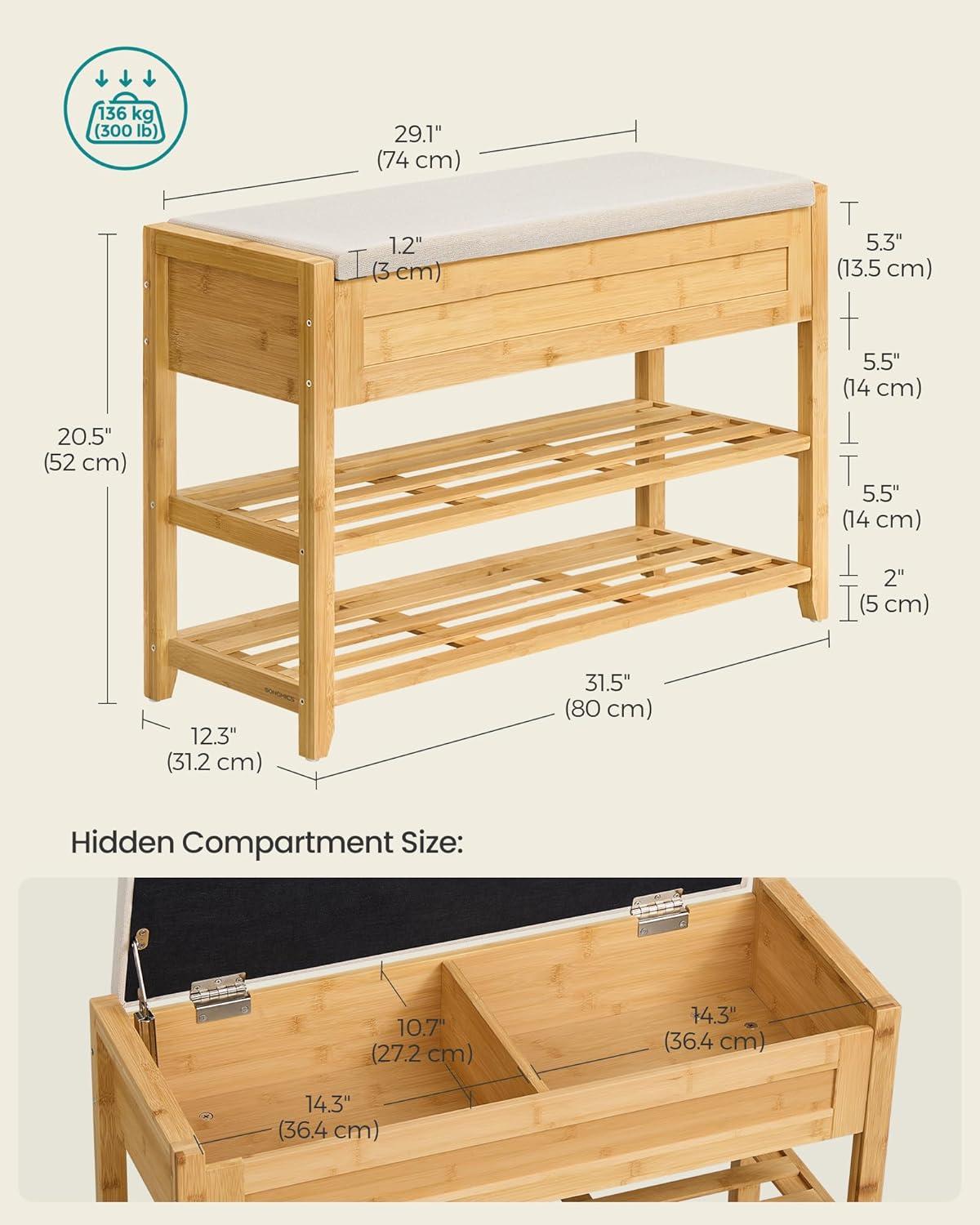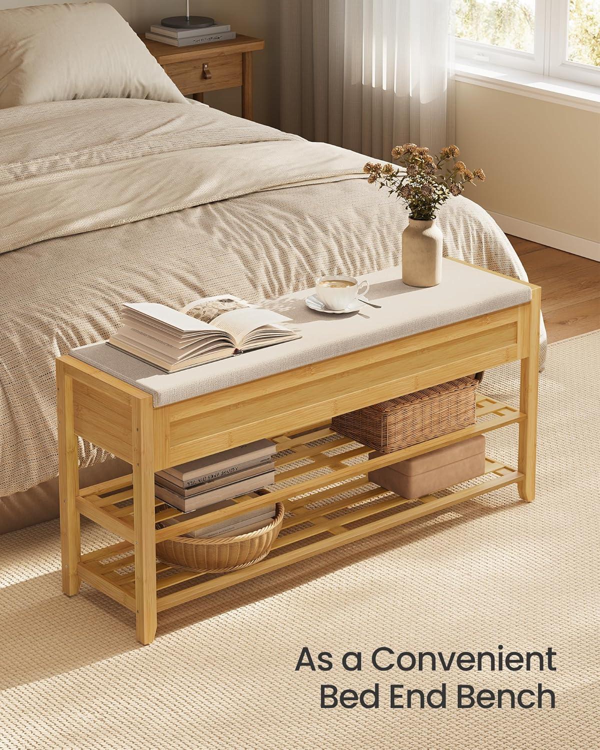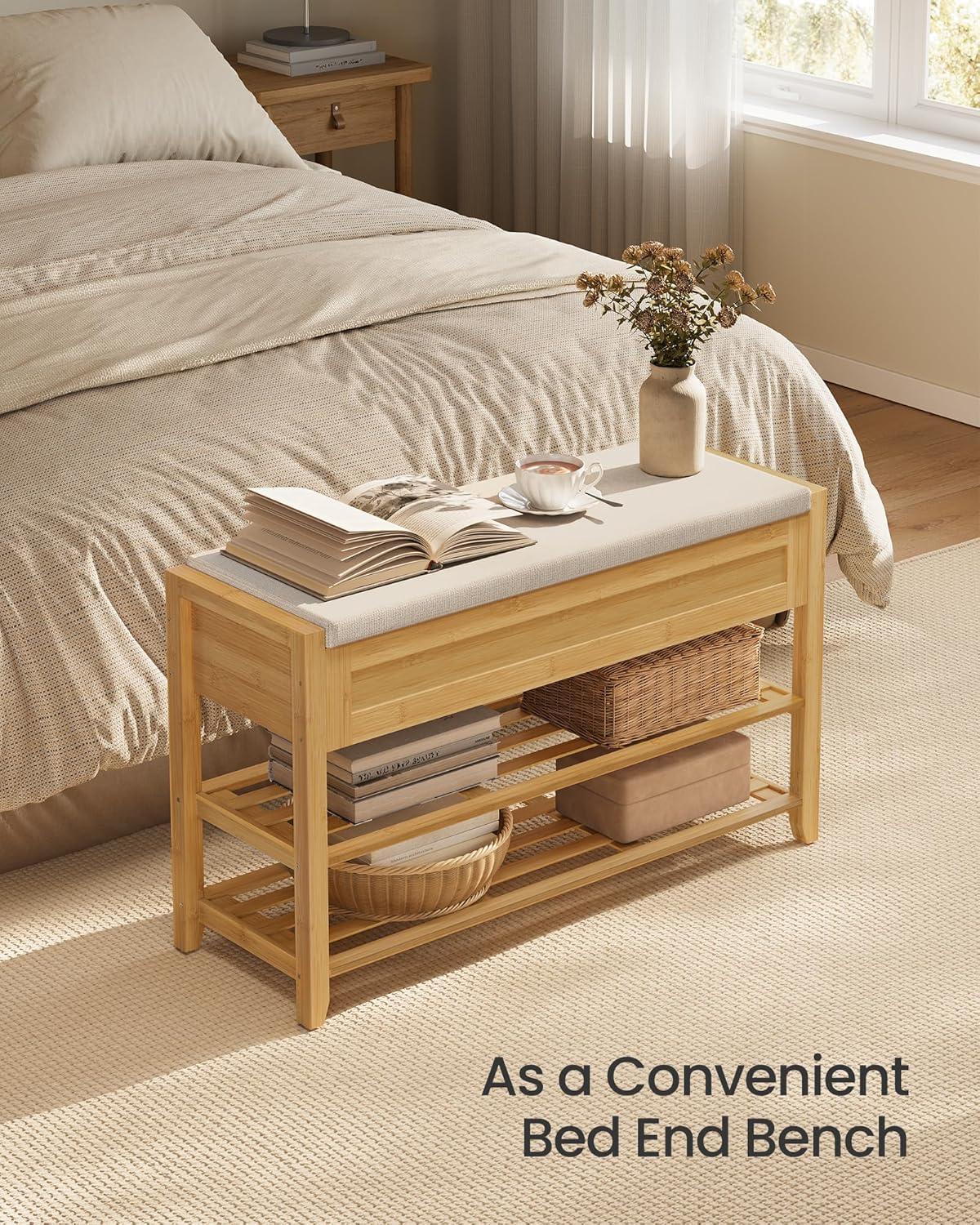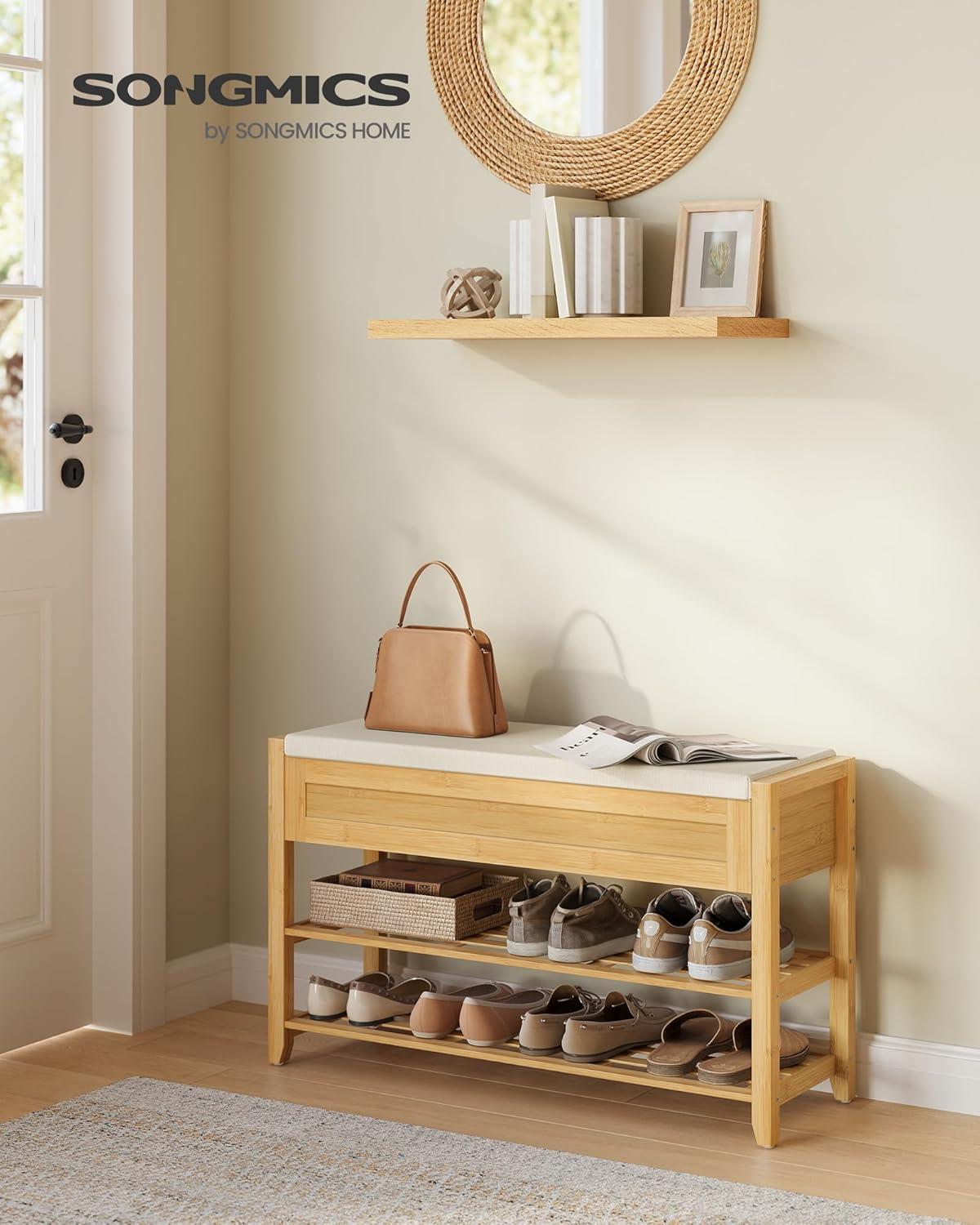 SONGMICS Storage Bench, Bamboo Shoe Rack, Entryway Furniture, 31.5 Inches Wide, Hidden Storage Compartments, 2-Tier Shoe Shelves, for Entryway, Living Room, Bedroom, Dorm, Ink Black ULSB056B01(Natural Beige)