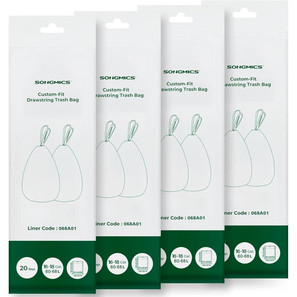 [Designed for Compatibility] These garbage bags measure 25.8” x 37.4”, making them compatible with SONGMICS 18-Gallon Kitchen Trash Cans ULTB520E68/ULTB520W68/ULTB520B68. They come in 4 rolls of 20 pieces each and are coded 068A02