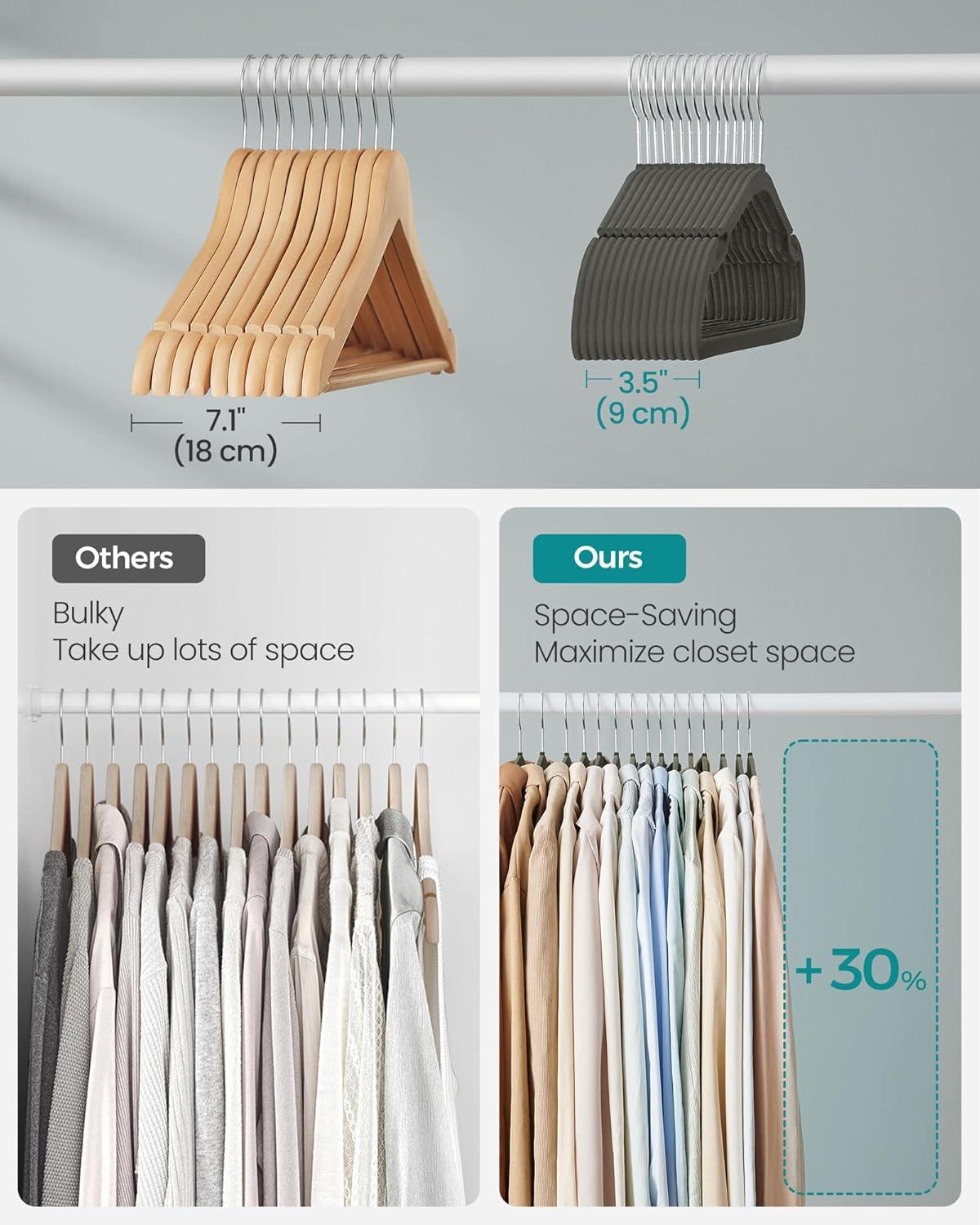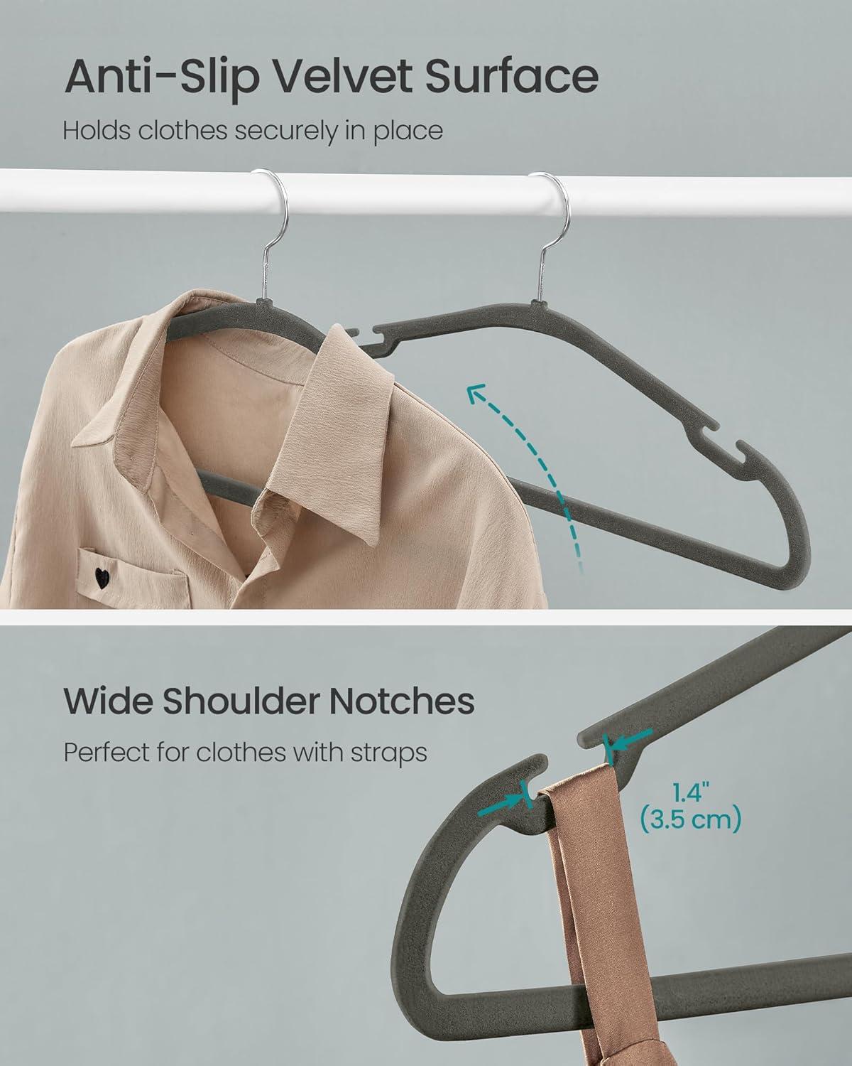 【CONSIDERATE DETAILS】The 360° swivel hooks of these velvet hangers make it easy to hang and access clothes, while the curved shoulder design prevents bumps and maintains the shape of your garments